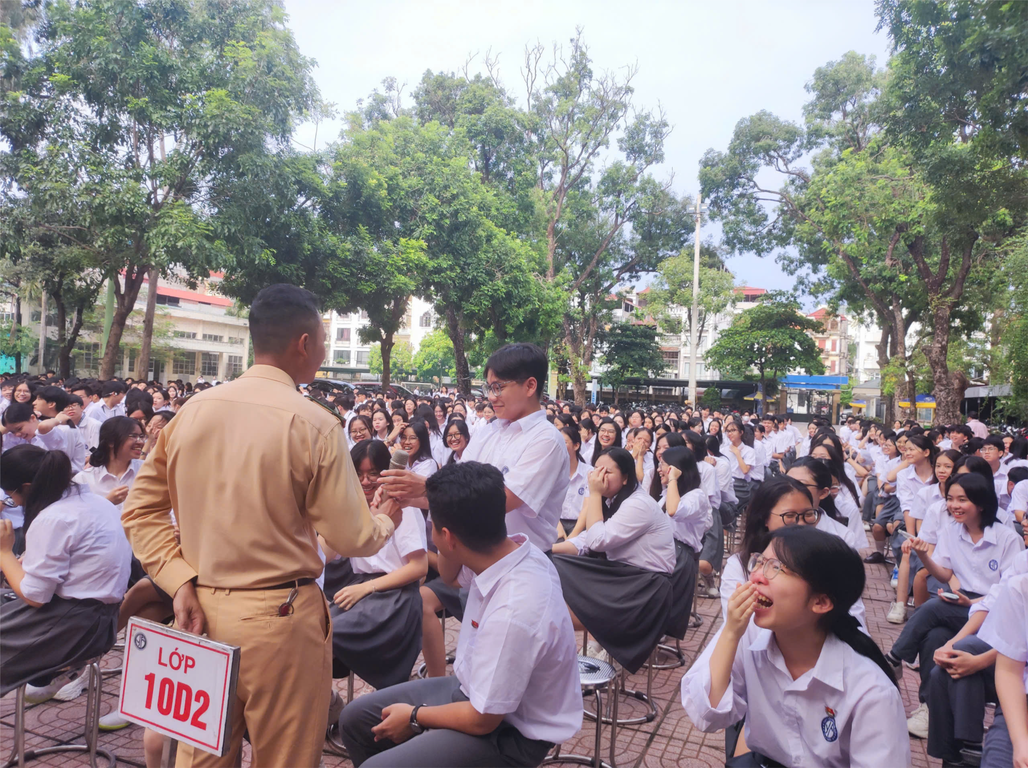 Đại diện cho các cán bộ, đồng chí Nguyễn Ngọc Vũ đã tham gia tuyên truyền và giao lưu cùng thầy cô và các em học sinh. Cán bộ đã mang đến cho giáo viên cũng toàn thể học sinh những con số đáng báo động về tình trạng tham gia giao thông của tuổi trẻ ngày nay. Chúng ta đang phải đối diện với một thực trạng đáng lo ngại với khoảng 8,96% vụ tai nạn giao thông xảy ra ở lứa tuổi thanh, thiếu niên theo thống kê trên toàn quốc. Đồng thời, thái độ khi tham gia giao thông của các em học sinh ở độ tuổi này chưa thực sự nghiêm túc dẫn đến hệ quả là tỷ lệ vi phạm ATGT vẫn đang có chiều hướng dần tăng lên. Chính vì vậy, thiếu tá Nguyễn Ngọc Vũ đã không ngừng nhấn mạnh và khẳng định tầm quan trọng và ý thức trách nhiệm của mỗi cá nhân, đặc biệt là các em học sinh cấp trung học phổ thông là vô cùng quan trọng.