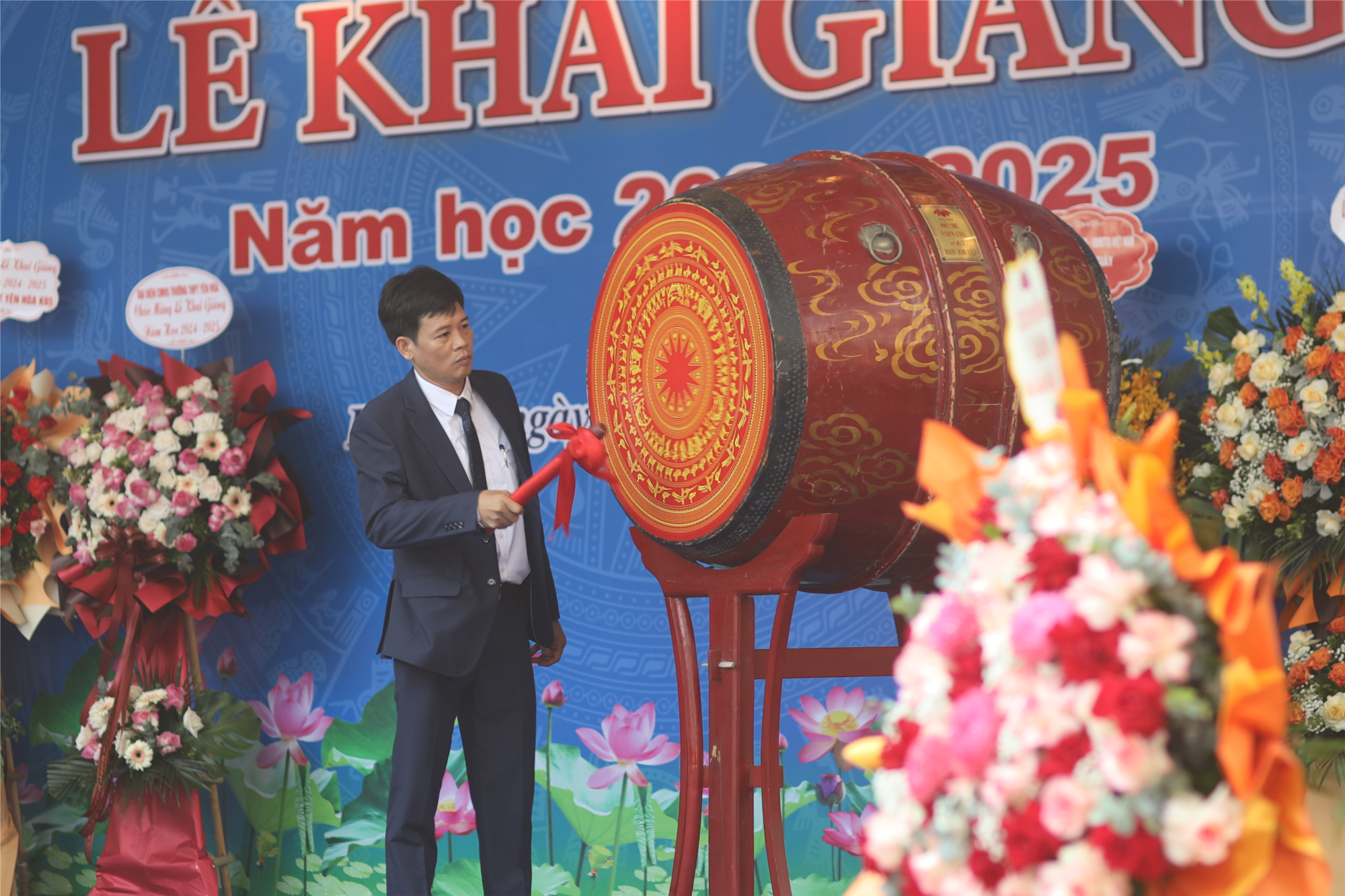 Khoảnh khắc đặc biệt của buổi lễ, nhà giáo Lê Hồng Chung, bí thư Chi bộ, hiệu trưởng nhà trường lên Tuyên bố và đánh trống khai giảng năm học mới. Trong bài diễn văn khai giảng, thầy đã tuyên dương những thành tích nổi bật của nhà trường trong năm học vừa qua, đồng thời đề ra phương hướng phấn đấu cụ thể của toàn trường trong năm học sắp tới. Niềm vui được chưng cất từ những thành tích ngọt ngào nhưng nhà trường không bao giờ tự bằng lòng với chính mình mà luôn nỗ lực từng ngày từng giờ để khẳng định vị thế ngôi trường đứng đầu. Thầy “mong các em sẽ viết tiếp “những câu chuyện đẹp, những câu chuyện vui, tìm đúng đường đến quang vinh”, nối dài trang thành tích của thế hệ mình vào truyền thống nhà trường”. Lời thầy đó, nhẹ nhàng mà sâu lắng vang vọng giữa sân trường đầy nắng vàng mật ngọt như thắp lên khát vọng trong trái tim mỗi học trò. Tiếng trống trường sôi nổi háo hức vang vọng hồi trống xung trận thở nào của ông cha. Tiếng trống tha thiết mến yêu gợi bao mùa đèn sách, hối hả giục giã chúng ta vào năm học mới đầy hứng khởi. Lớp lớp thế hệ học sinh sẽ không ngừng rèn đức luyện tài làm vẻ vang truyền thống nhà trường, rạng rỡ Thủ đô ngàn năm văn hiến.