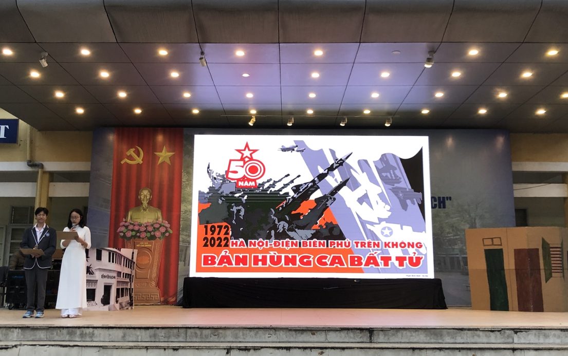 Chiến thắng “Điện Biên phủ trên không” là một sự kiện có ý nghĩa lịch sử to lớn đối với cả dân tộc nói chung và đối với thủ đô Hà Nội nói riêng. Để chào mừng ngày kỷ niệm, thầy và trò nhà trường đã cùng nhau thực hiện chuỗi hoạt động đa dạng, thú vị và ý nghĩa. Mở đầu là phần hoạt cảnh ngắn cùng video “Trở về quá khứ” - một trong những sản phẩm được các tập thể lớp xây dựng công phu. Đoạn video đã đưa ta về với Hà Nội của 50 năm trước – những ngày tháng cả Thủ đô đang gồng mình trong cơn cuồng phong của những đợt B52 do Đế quốc Mỹ đổ xuống. Dù chỉ vài phút ngắn ngủi nhưng phần hoạt cảnh đã cung cấp thông tin chi tiết về những ngày tháng gian khổ mà hào hùng khi ấy. Thầy cô và các bạn học sinh cảm động xót thương xen lẫn niềm tự hào khó tả khi nhìn lại những trang sử anh hùng của dân tộc.