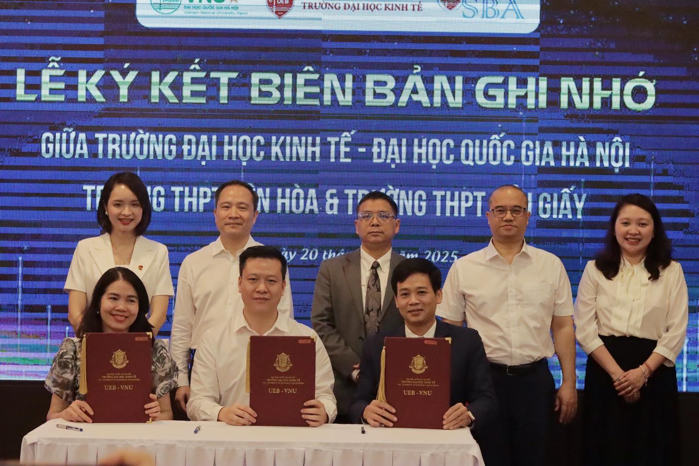 Vào sáng chủ nhật ngày 20/4/2025, tại Trường Đại học Kinh tế - Đại học Quốc Gia Hà Nội (VNU-UEB), trong khuôn khổ chương trình “Hội thảo ra mắt các chuyên ngành Quản trị kinh doanh và Định hướng nghề nghiệp”, TS Lê Hồng Chung - Hiệu trưởng trường THPT Yên Hòa và PGS.TS. Lê Trung Thành - Hiệu trưởng Trường Đại học Kinh tế - Đại học Quốc Gia Hà Nội đã chính thức ký kết Biên bản ghi nhớ hợp tác (MOU). Sự kiện ký kết đánh dấu bước tiến quan trọng trong việc tăng cường hợp tác giữa trường THPT Yên Hòa và VNU-UEB thể hiện sự quyết tâm xây dựng mối quan hệ đối tác lâu dài giữa VNU-UEB và THPT Yên Hòa.